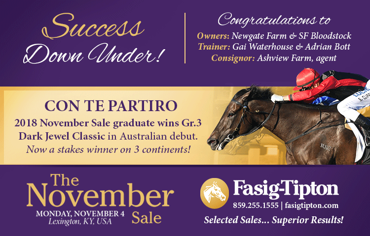 Con Te Partiro was one of two daughters of Scat Daddy which Newgate bought out of last year's Fasig-Tipton November Sale, paying US$575,000 for the Saratoga and Royal Ascot stakes winner.