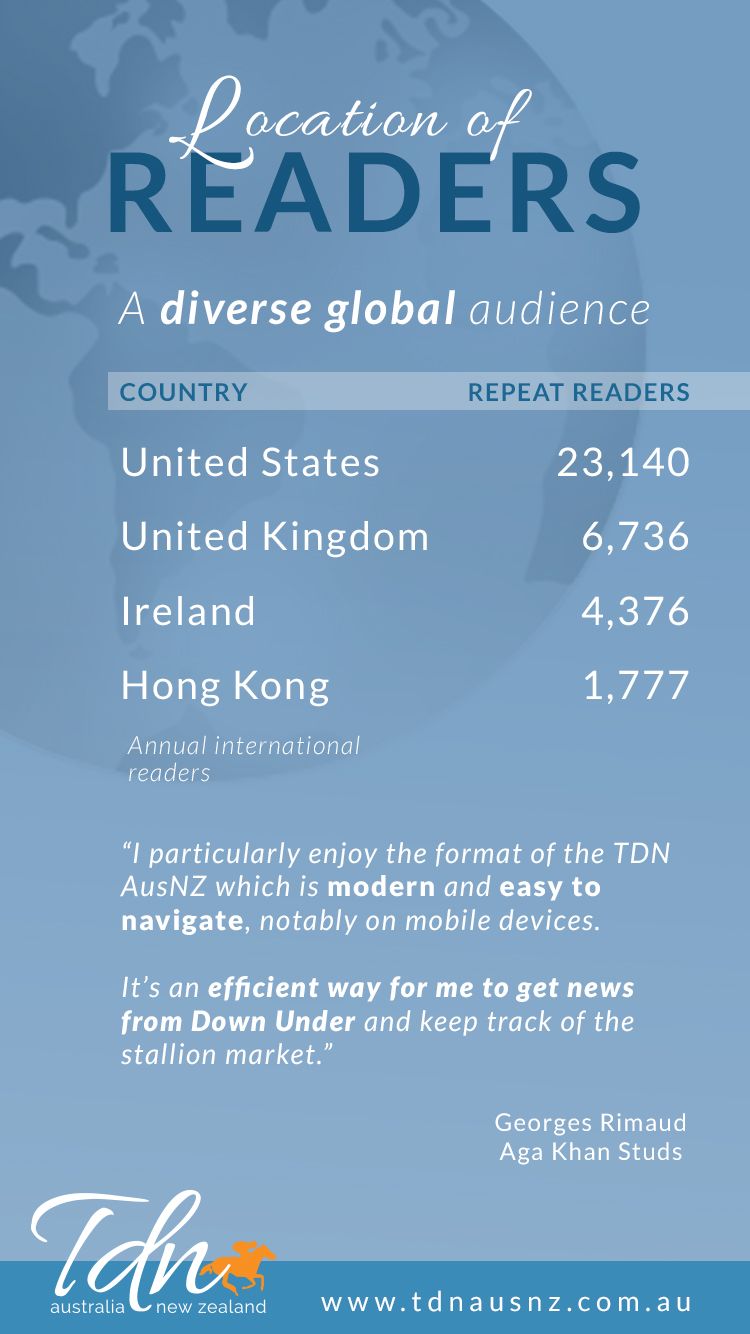 “We’re really excited about him,” John Kelly says. “He was a super racehorse, the highest-rated New Zealand 3-year-old since Bonecrusher. He’s out of a Zabeel mare (Axiom), and we think he’s going to be terrific to mate to the Danehill line in Australia. There’s a lot of positives to him.”