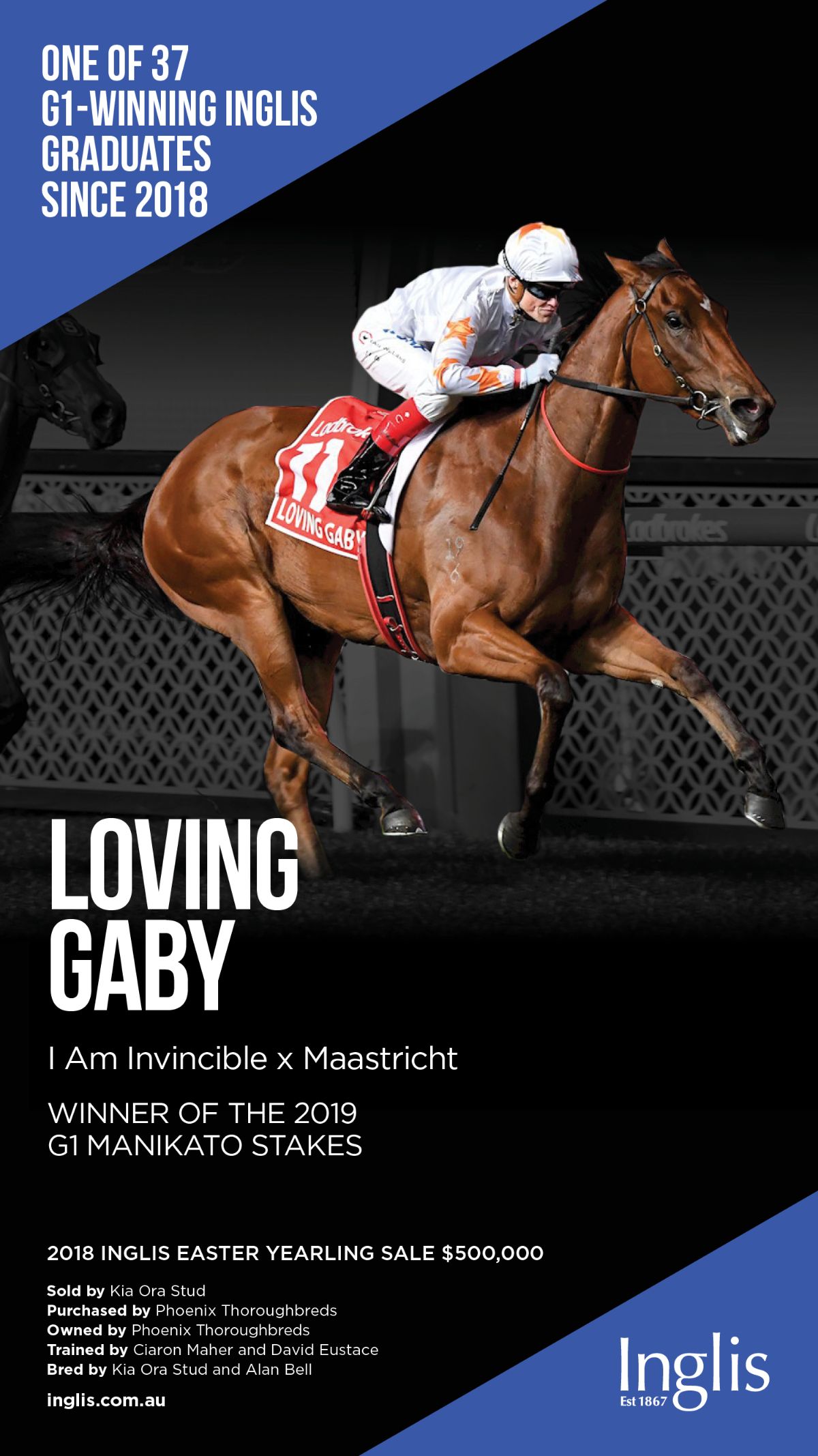 With her husband Roger McGlade, she also celebrated consecutive G1 Avondale Cup wins from 2002 with Regal Krona (NZ) (Krona {NZ}), while she also bred, raced and co-trained Karlos (NZ) (Krona {NZ}), a son of Just Jojo, who was the last winner trained by McGlade when he won the 2013 Koral Steeplechase.