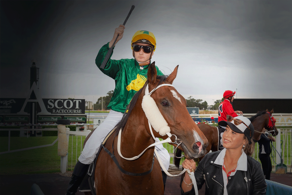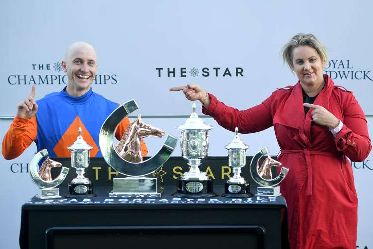 Jockey James Innes Jnr with trainer Wendy Roche after their G1 Doncaster win