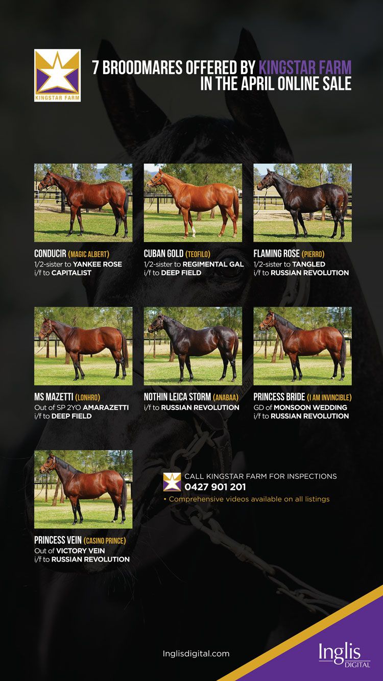The pair join the likes of Fastnet Rock mare Miss Barley, dam of Group 1-winning sprinter Gytrash (Lope De Vega {Ire}), Group 1 performer Happy Hannah (More Than Ready {USA}) who is in foal to Zoustar and multiple winner and stakes performer Invictus Salute (Exceed And Excel) as final wildcard entries.