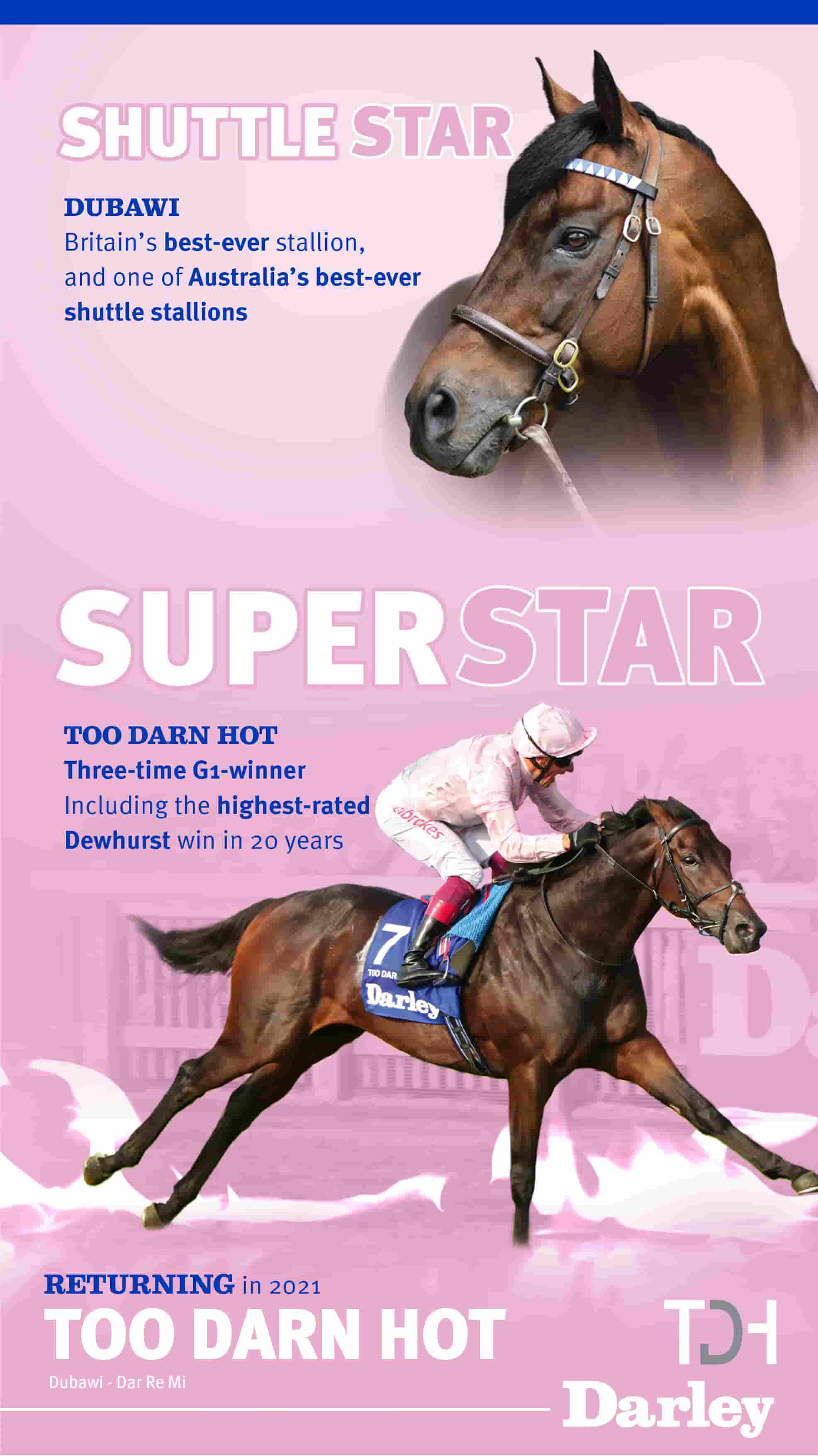 The exceptionally talented Russian Camelot secured two Group 1 victories in an 11 start career and he will be joined by precocious sprinter Doubtland at the Victorian property.