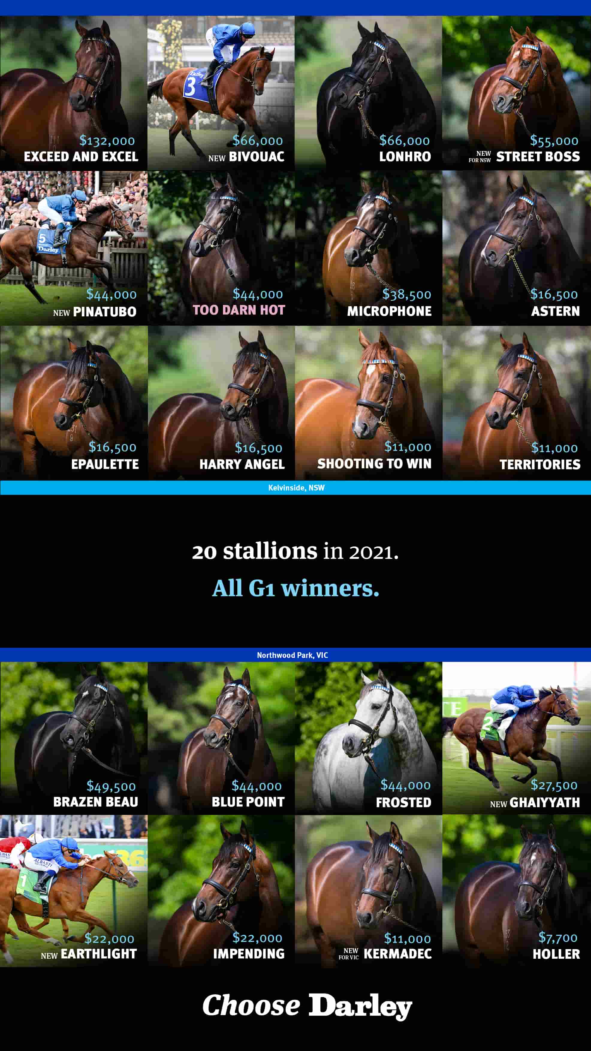 Now commanding a service fee of $132,000 (inc GST), Exceed And Excel is the sire of 1549 winners from 2204 runners. He has been represented by 182 individual stakes winners worldwide, including 16 at Group 1 level, headed by the likes of Guelph, Mr Stunning, Excelebration (Ire), Bivouac and Overreach.
