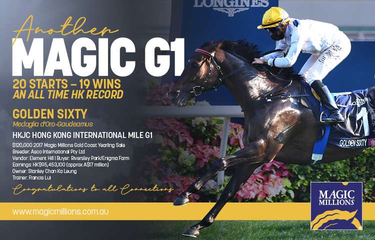 Golden Sixty has become yet another champion by Darley stallion Medaglia D'Oro, who shuttled to Australia for eight years and has produced 31 Australian-bred stakes winners, including Group 1-winning stallion sons Vancouver and Astern as well as fellow elite winners Flit and Crown Prosecutor.
