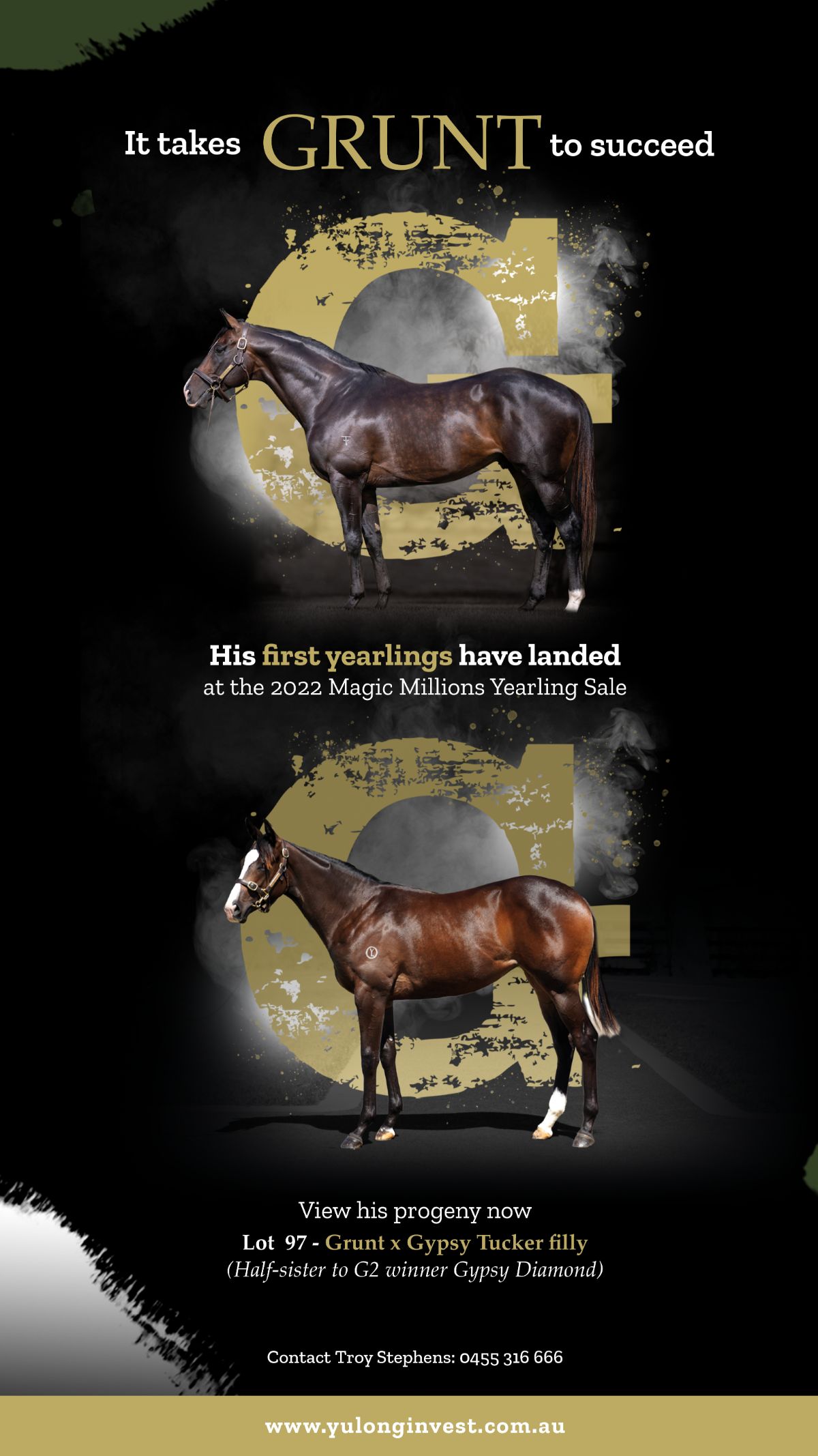 A chestnut colt by Brave Smash (Jpn) out of Sister Souss (Husson {Arg}). The dam has placed at Group 1 level and is a full sister to Listed winner Hussousa. The second dam, Petousa (Redoute’s Choice), is a half-sister to Rosendahl (Octagonal {NZ}), dam of Group 3 winner Red Eclipse (Red Dazzler), and a half-sister to Listed winner Espurante (Flying Spur), dam of Listed winner Jennifer Lynn (High Chaparral {Ire}).