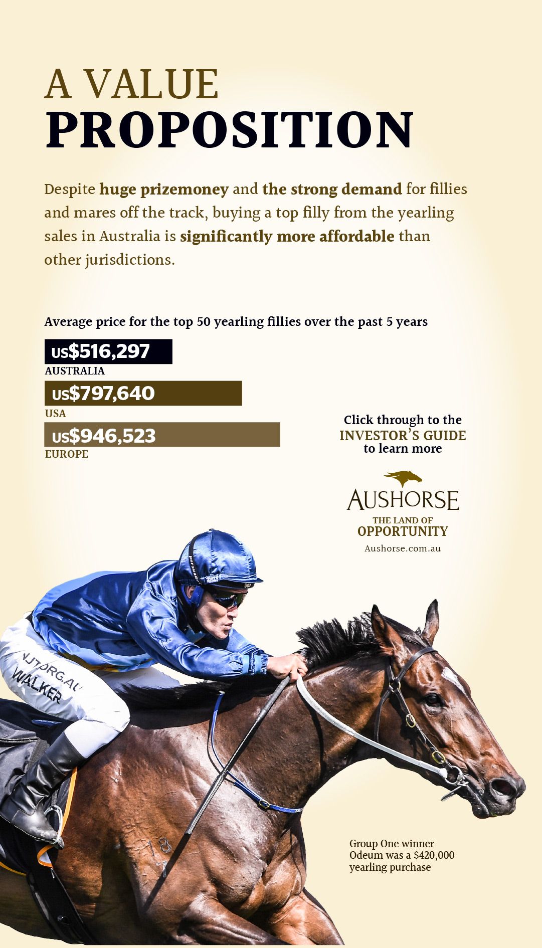 Global Glamour herself sold for $65,000 through the Magic Millions Gold Coast sale ring as a yearling in 2015 and after a stellar racing career which included victories in the G1 Flight S. and G1 Thousand Guineas, she returned to be purchased for $1.55 million as a broodmare in 2018.