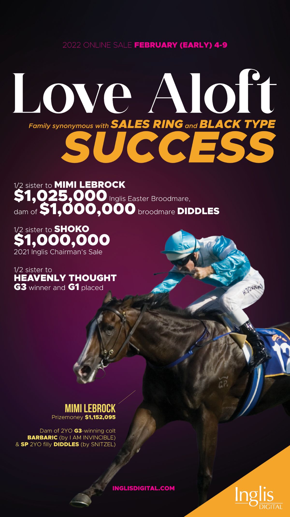 Bryan had picked him out as a yearling for $10,000 and while he couldn't syndicate him, the colt quickly repaid him, winning the Listed Breeders' Plate at his first start. Later in his 2-year-old season, he would win the G1 Castlemaine S. at Eagle Farm, giving Guy his second Group 1 winner.