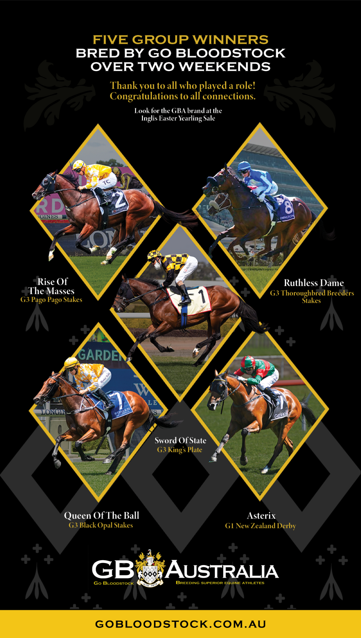 The yellow silks and black epaulettes are widely recognised now, but among others the Sheikh has campaigned are Mtoto (GB), who won a stack of Group 1 races in Europe in the eighties, and Tobougg (Ire), who won Group 1s in Ireland and France before a shuttle career that included Australia.