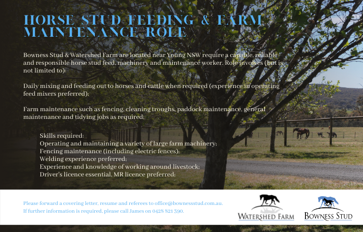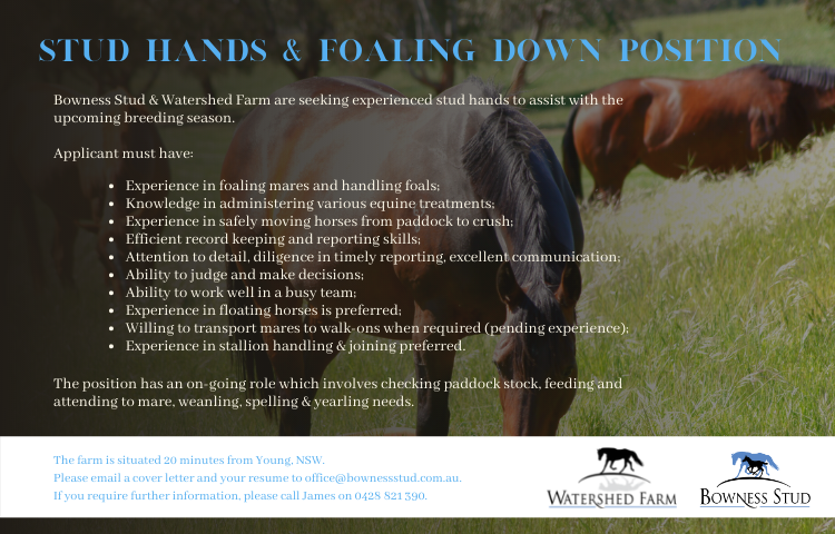 “I’d love to maybe purchase more property eventually and stand a couple of stallions,” she said. “That would be my ultimate goal. I work with the stallions at Arrowfield and in the covering shed, and that’s really where my passion is.”