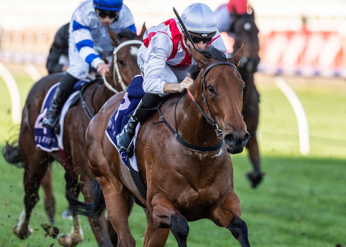 Devoted winning the Listed Belmont Guineas on Saturday | Image courtesy of Western Racepix