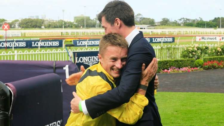 Harry Eustace and Tom Marquand embrace after Addeybb's (Ire) win in the 2020 G1 Ranvet S. | Image courtesy of Tom Marquand