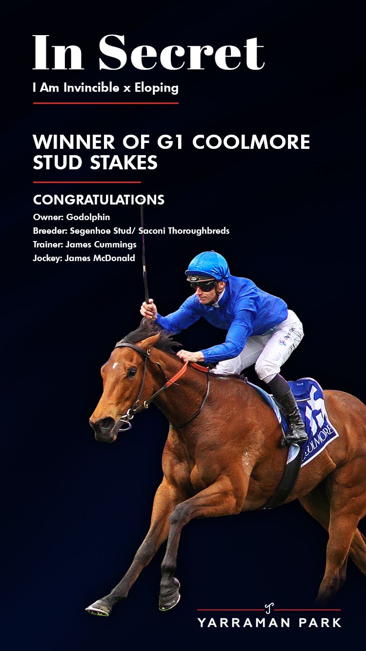 With her victory in the Group 1, In Secret becomes the 19th elite-level winner for I Am Invincible and his second in the G1 Coolmore Stud S., with last year’s winner Home Affairs, being his second, while Brazen Beau, who won the race 2014, was his first. The stallion stands at Yarraman Park Stud for a fee of $247,500 (inc GST).
