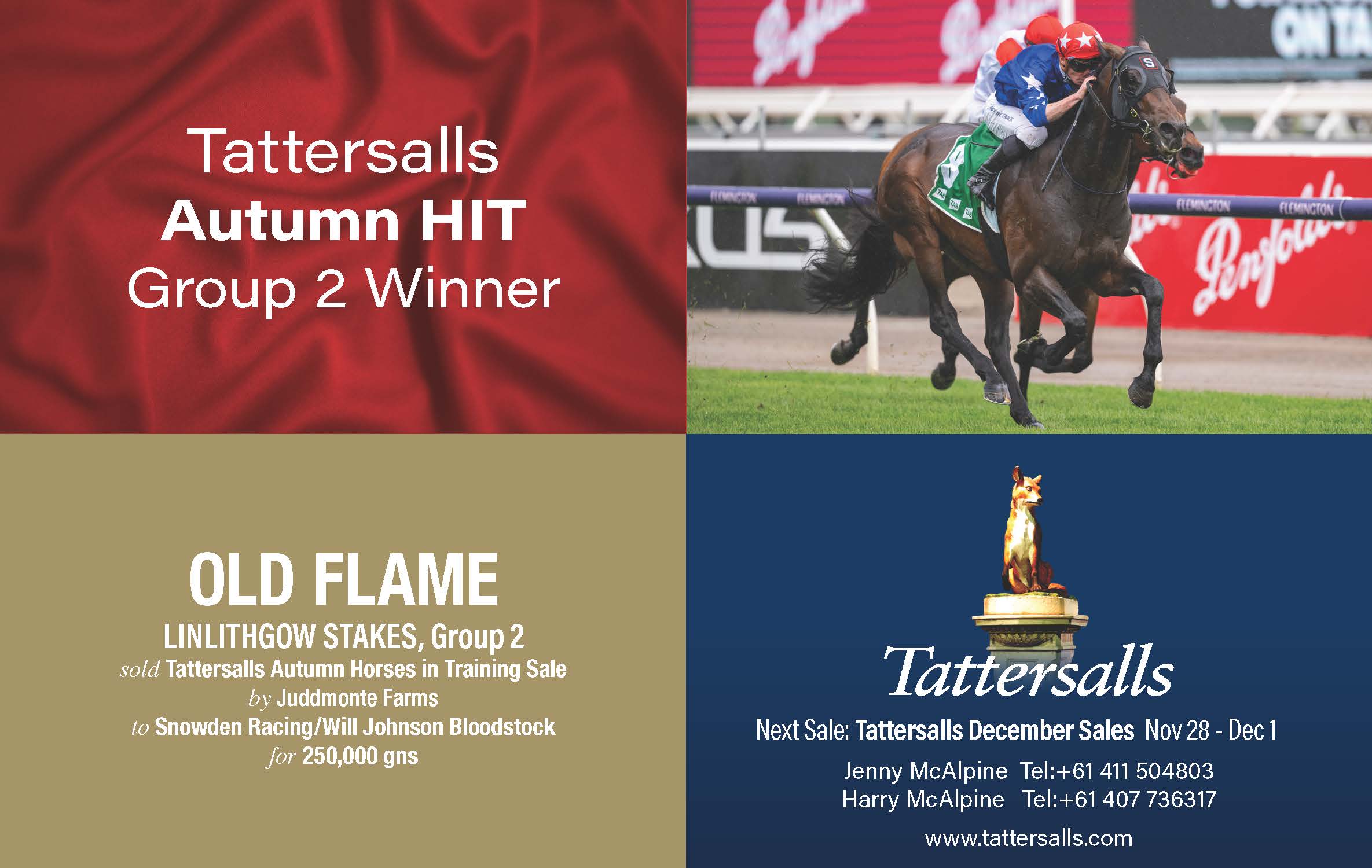 You only need look at the Australian activity at the Tattersalls Horses in Training Sale earlier this week to know that it has been a very good source of winners in the past and on Saturday at Flemington the auction produced yet another stakes-winning graduate as the Peter and Paul Snowden-trained Old Flame (GB) (Invincible Spirit {Ire}) dispatched his rivals in the G2 Linlithgow S.
