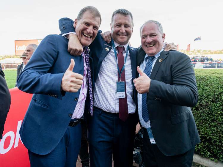 Jason Walsh, Vin Cox, James Cummings after winning the G1 Coolmore Stud S. | Image courtesy of Bronwen Healy