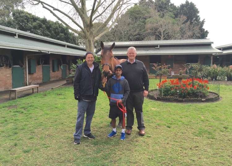 Garry Charny, Ravi (stablehand) and Anthony Cummings with his Fastnet Rock filly Believe, who was third in the Australian Oaks in 2016