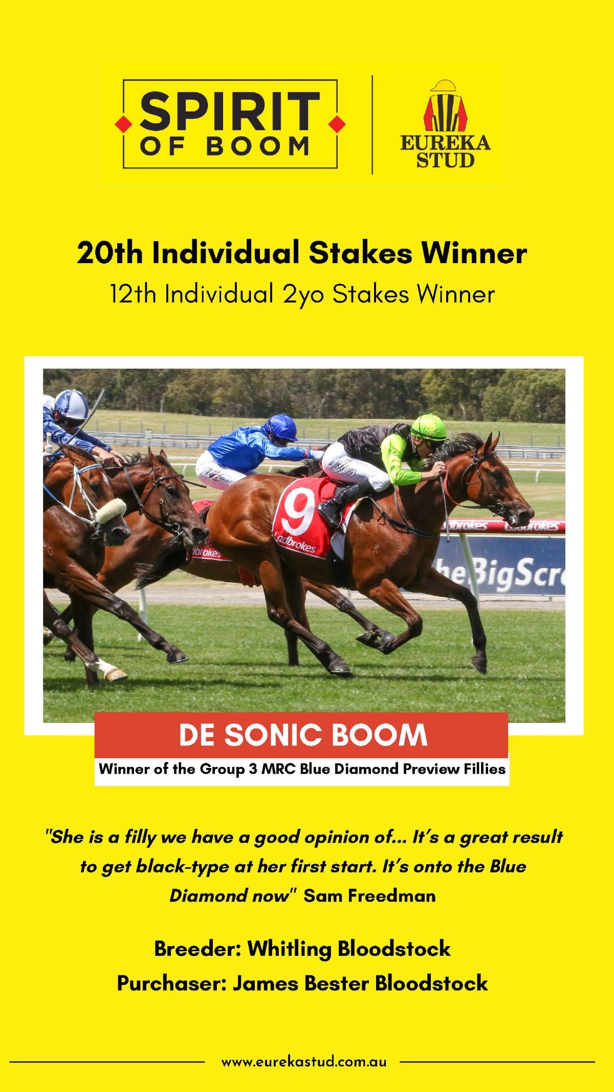 At the 2018 Magic Millions National Broodmare Sale they purchased two-time winner Dazzling Lady (NZ) (Lonhro) for $155,000, a maiden mare in foal to So You Think (NZ). Pleased with the resulting filly foal, they sent her back to the Coolmore stallion which resulted in a sister.