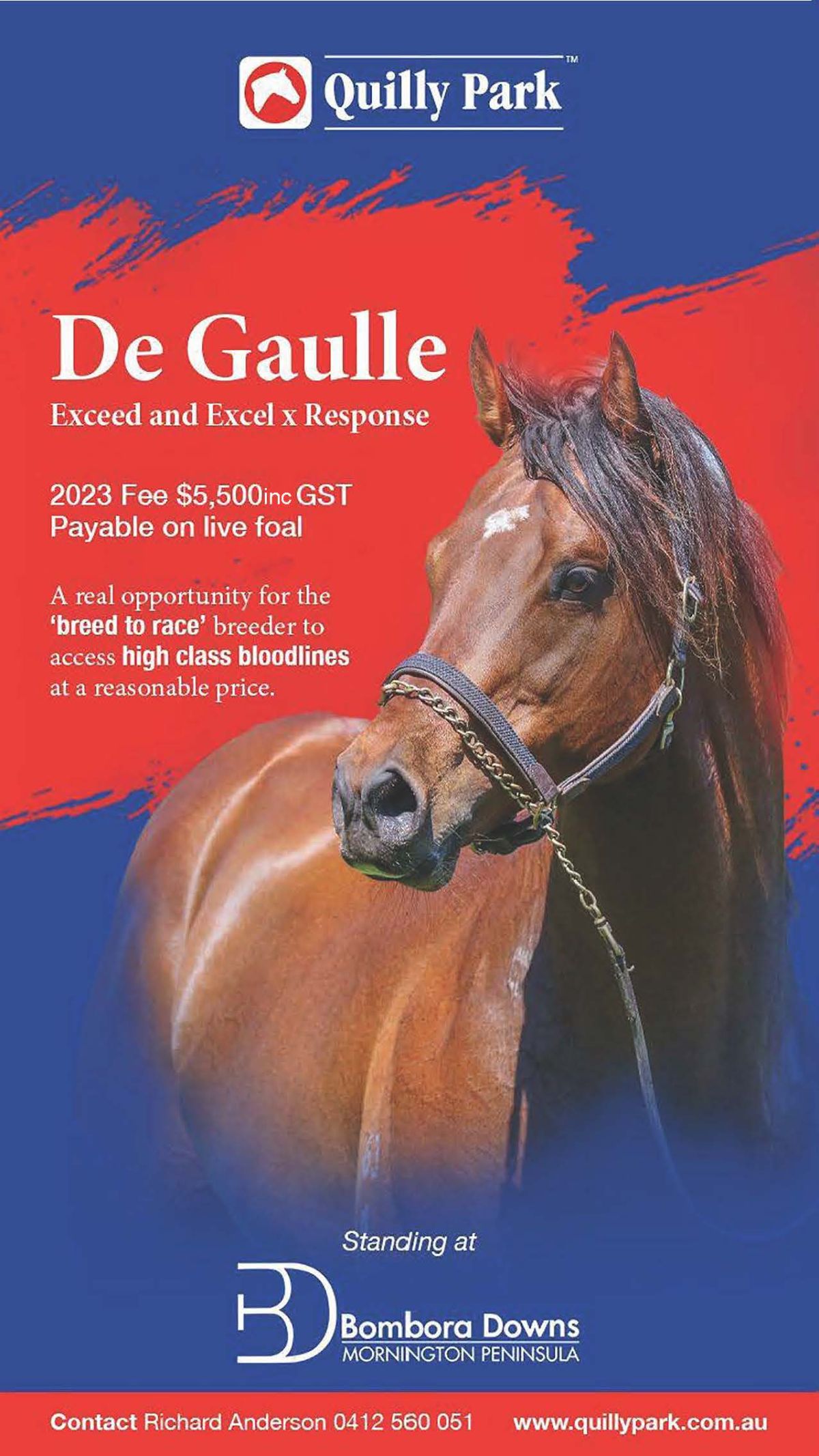 De Gaulle will be available to breeders for $5,500 (inc GST) and will be standing at Bombora Downs on the Mornington Peninsula.