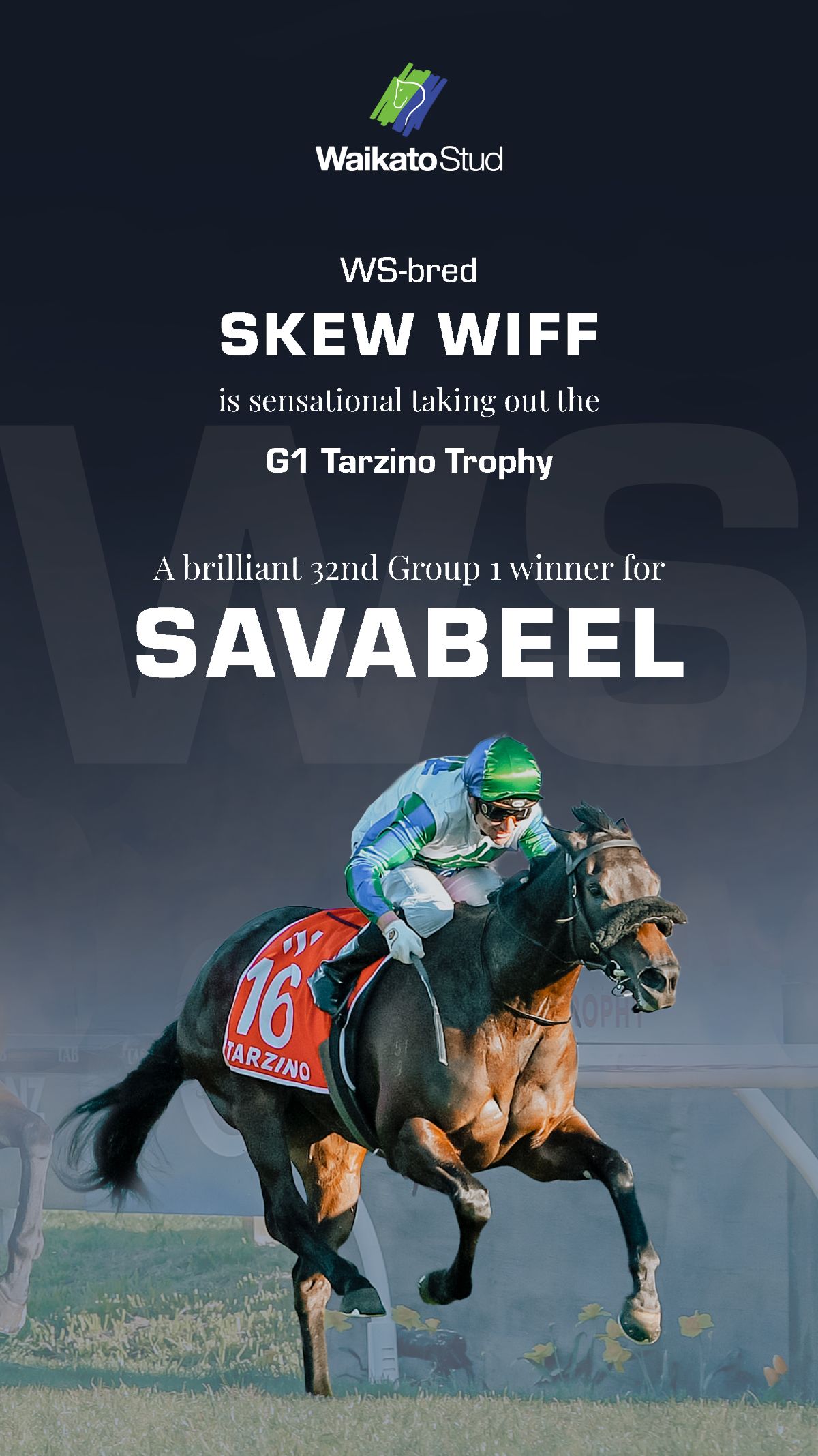 It was a super Saturday for Mark Walker and Sam Bergerson under the Te Akau Racing banner to claim the two 3-year-old features. The pair sent the Waikato Stud-bred- and -owned mare Skew Wiff (NZ) (Savabeel) out in the G1 Tarzino Trophy.