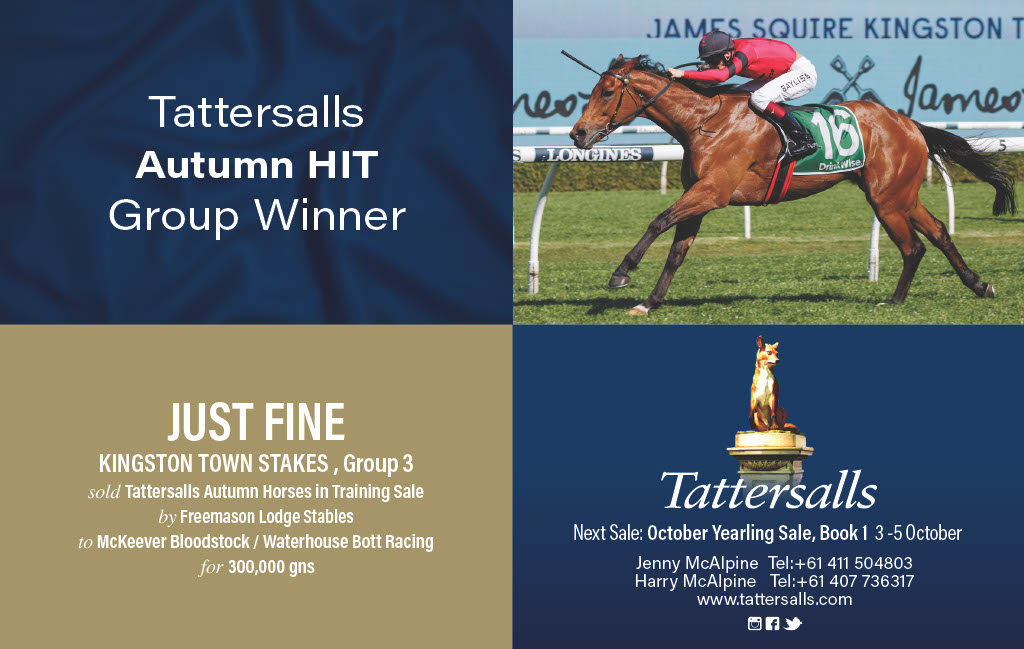 Known in the UK as King Charles' first winner, Just Fine was purchased by McKeever Bloodstock and Waterhouse Bott Racing for 300,000gns (AU$606,700) at the 2022 Tattersalls Autumn Horses in Training Sale.