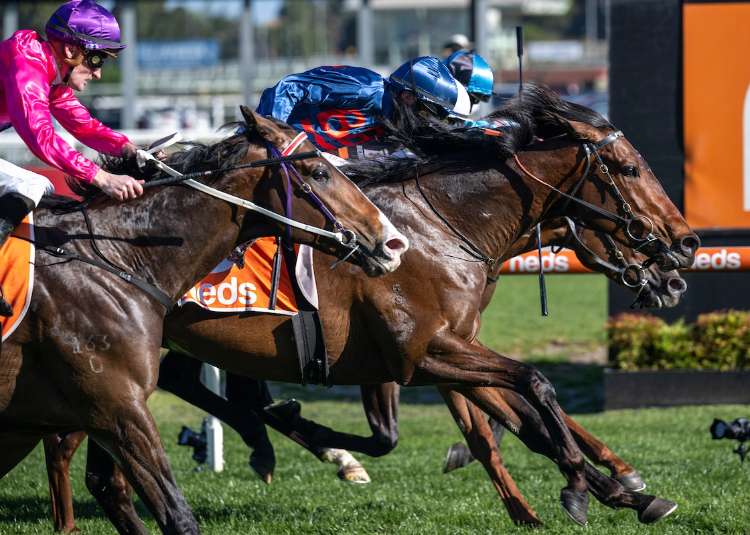 Steparty (navy blue cap) dives to the line to win the G3 Caulfield Guineas Prelude on Saturday | Image courtesy of The Image Is Everything