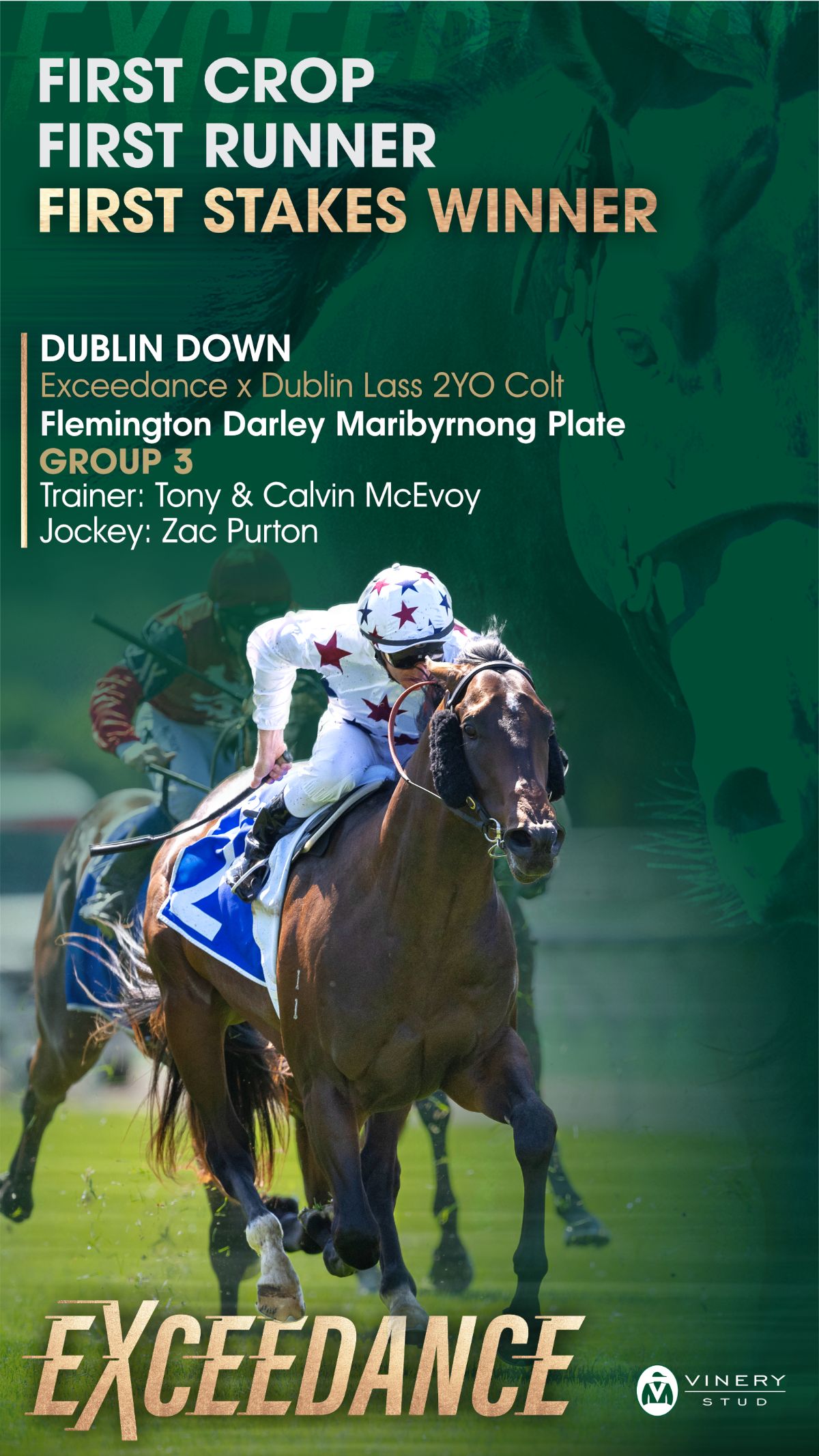 Peter Orton, Vinery Stud’s general manager, was on course at Flemington to witness Dublin Down scorch the turf, “Dublin Down’s victory in the G3 Maribyrnong Plate was a fantastic result because the progeny of Exceedance are not pre-Christmas horses.
