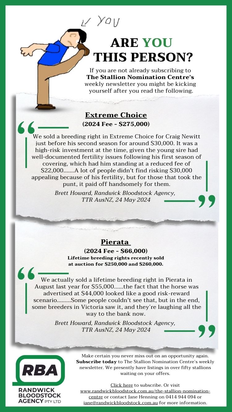 “That crop didn’t sell well and everyone thought that they were just a bit coarse and heavy. But the one attribute that they nearly all had was that lovely, big loose-swinging action. That was a real trait of his animals. And they also all had good temperaments. They were all like their dad in that respect. That’s important for Australia, and particularly in that era when it was a hard-working environment for racehorses - they needed to be tough.”
