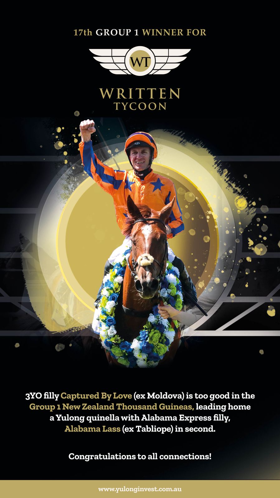 Captured By Love (Written Tycoon) emerged victorious over Alabama Lass (Alabama Express) in the G1 New Zealand 1000 Guineas at Riccarton Park on Saturday, turning the tables from their last meeting in the G3 Gold Trail S. earlier in the spring. Alabama Lass was brave in defeat, digging deep one last time in the home straight when she felt Captured By Love looming behind her, but the Te Akau Racing-trained filly surged past her for a 1.3l victory.