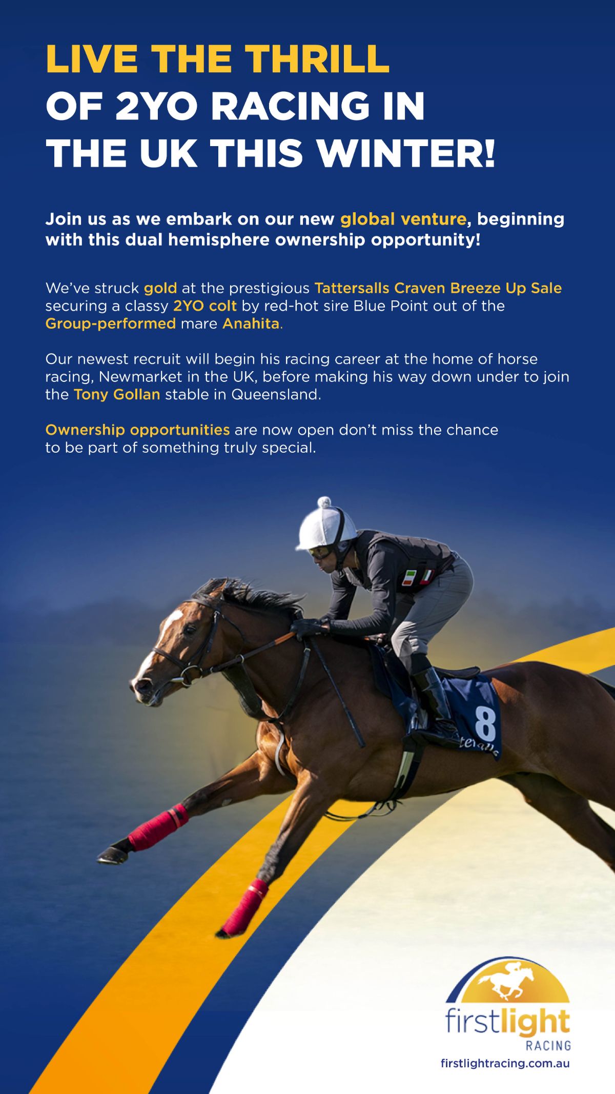 The colt sold for a jaw-dropping $1.7 million - and while that might seem like the fairytale ending, the story didn’t stop there. The full sister a year earlier was sold for $400,000 and is already showing promise under the care of Michael Freedman as Apocalyptic (Extreme Choice); she ran a great second behind the talented Gallo Nero (Wootton Bassett {GB}) on debut late last year.