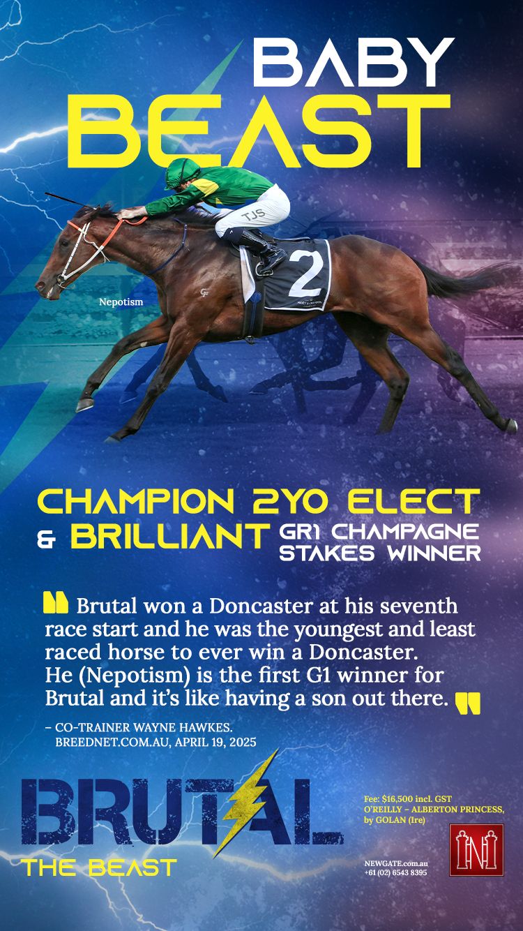 Second season sire Brutal (NZ) was announced by Newgate Farm to stand at $16,500 (inc GST) for 2025, the same fee as in 2024, and he’s bound to be popular now that he has his first Group 1 winner. A son of Champion NZ Sire O’Reilly (NZ), whose other successful sons are Shamexpress (NZ), Sacred Falls (NZ), and Grunt (NZ).