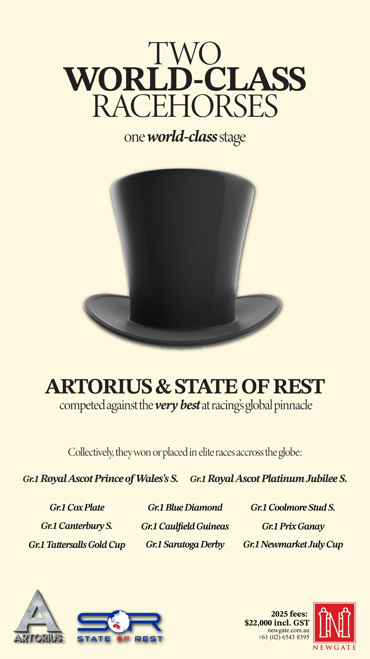 His 160 stakes winners, from 1631 runners, at an impressive rate of 9.8 per cent stakes winners to runners, is headlined by 23 Group 1 winners. His ten racehorses with Championship titles are 2022/23 Champion 2YO Shinzo, 2017/18 Champion 2YO Estijaab, 2016/17 Co-champion 2YO Colt Invader, 2019/20 Champion 2YO Filly Away Game, 2020/21 Champion 2YO in NZ Sword Of State, 2017/18 Champion 3YO Colt Trapeze Artist, 2013/14 Champion 3YO Colt Shamus Award, 2024’s Joint Leading 3YO Male on the WBR Rankings (Sprint) Switzerland, Top Male on The 2016-17 NZ 2YO Free Handicap Summer Passage, and 2017/18 Champion Sprinter & Older Horse in Australia Redzel.