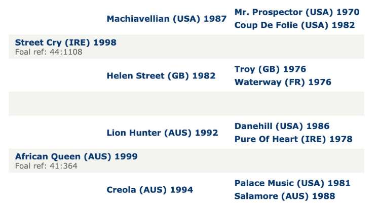 She is a full sister to Secret Agenda (Not A Single Doubt), a seven-time winner including the G1 Robert Sangster Stakes, G2 Sapphire Stakes, G3 Gucci Stakes, G3 How Now Stakes, and the Listed Bob Hoysted Handicap.