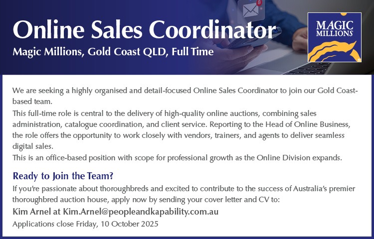 Sales: Emirates Park took Charm Stone to the 2022 Magic Millions Gold Coast Yearling Sale where she attracted much attention, selling to Sheamus Mills Bloodstock (FBAA) for $1.55 million. The recent sale of a 10% share via Inglis Digital values her at $3.1 million.