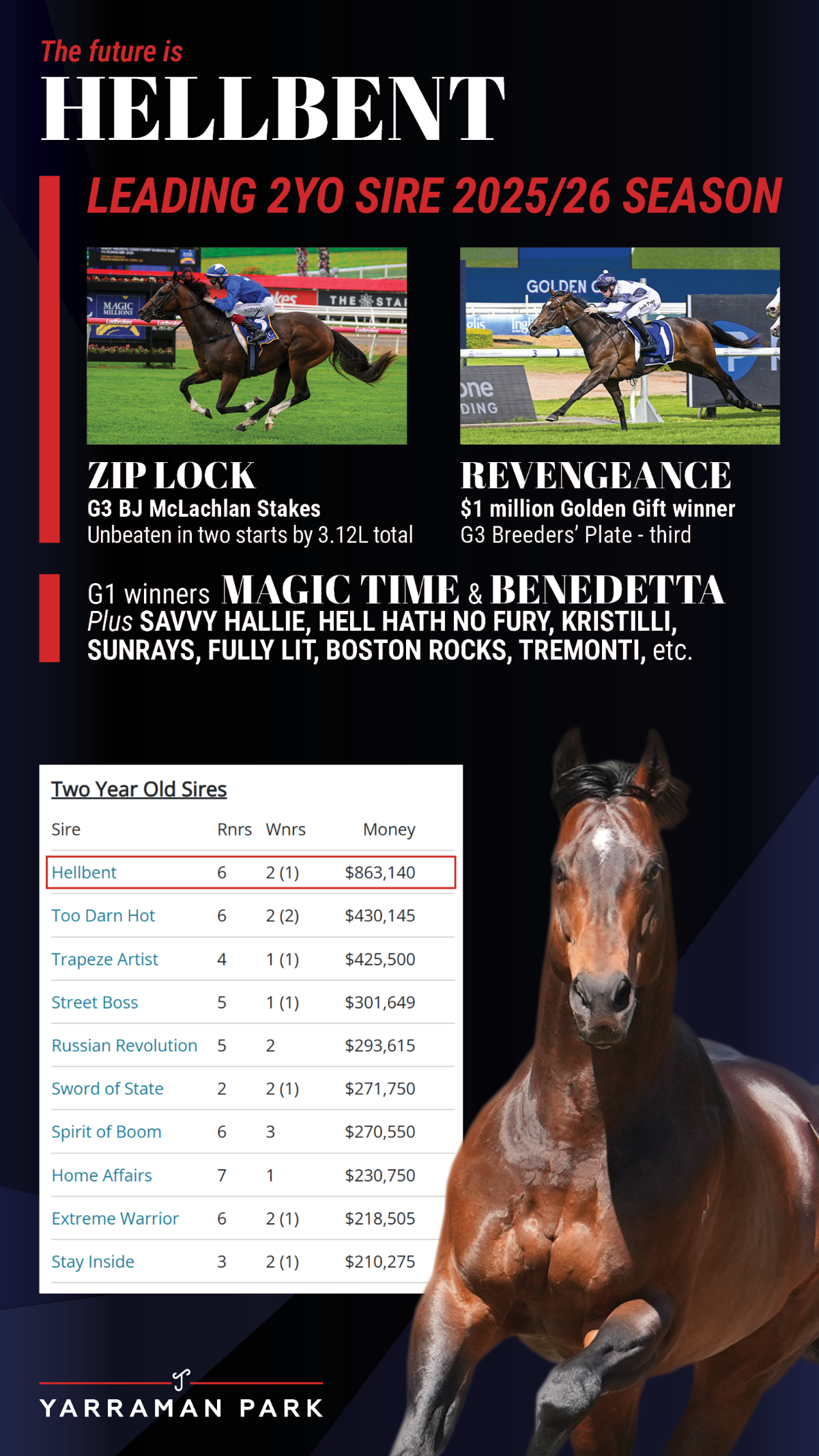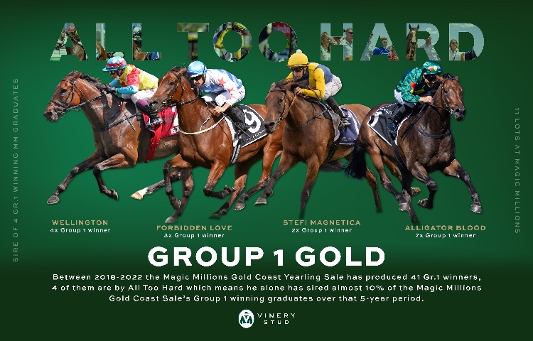 All Too Hard, a stalwart for Vinery Stud, tops the list with 8 races won this season to date by his progeny. He’s a son of Casino Prince, a son of Flying Spur, who is a son of Danehill. All Too Hard’s 4-year-old gelding Patch Of Stars is headed to the rich 4-Year-Old series. All Too Hard has 11 yearlings in the 2026 Magic Millions Gold Coast Yearling Sale.