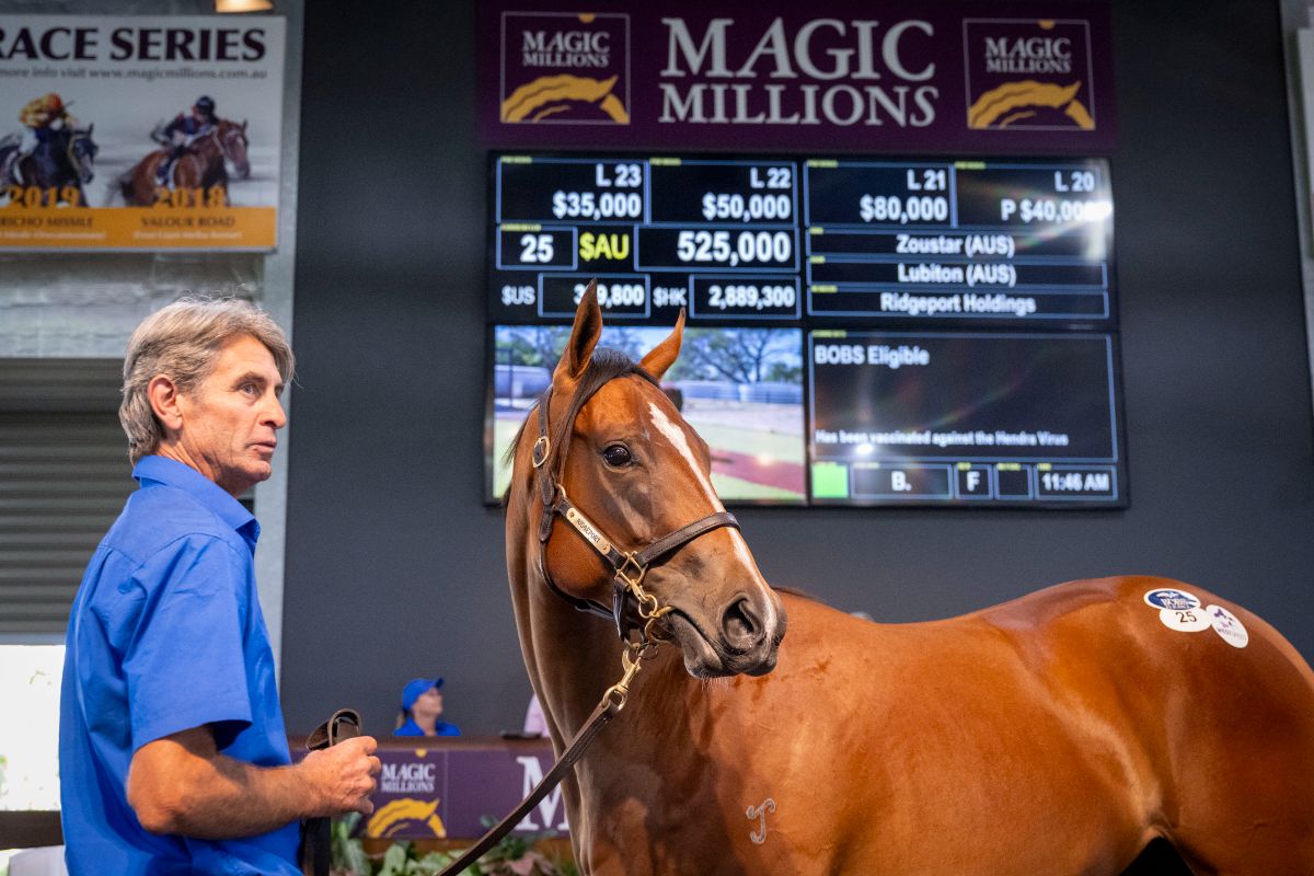 A $500,000 purchase for China Horse Club, Newgate Bloodstock, and associates from Baramul Stud’s Gold Coast draft, he is a full brother to multiple Group performer Snitzel Miss and a three-quarter-brother to Group 3-placed Flashing Steel (Not A Single Doubt). Mick Price went to $750,000 to secure his Zoustar half-brother at the Gold Coast this year.
