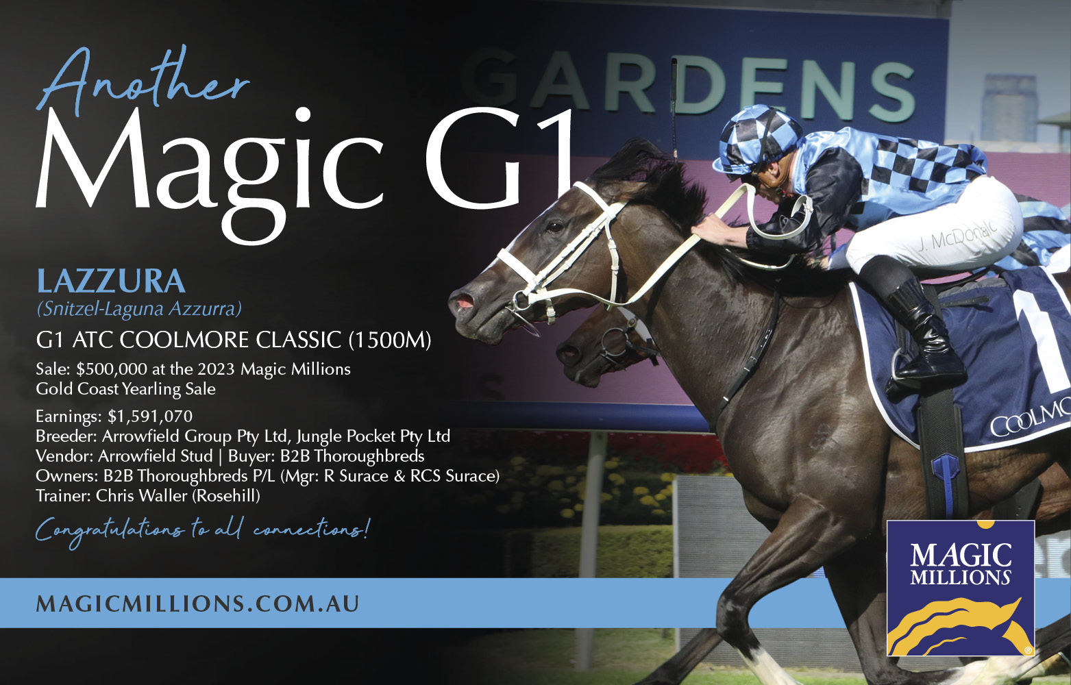 Later winners in the G1 Australian Derby include Tavago (NZ) (Tavistock {NZ}), Jon Snow (NZ), and the G1 Rosehill Guineas winners includes Gingernuts (NZ) (Iffraaj {GB}).